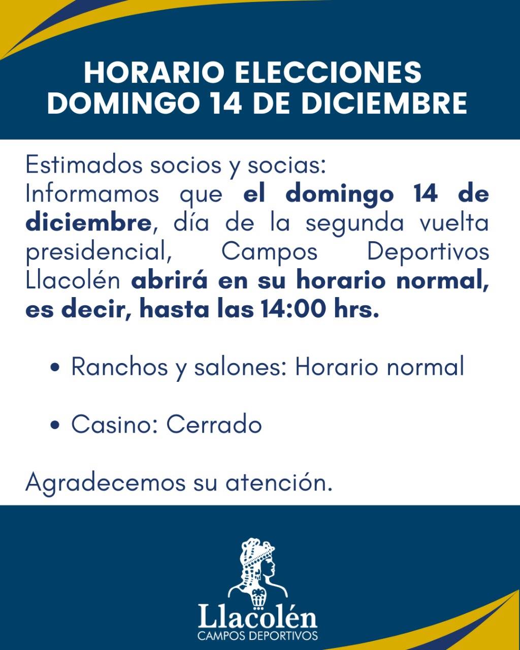 Informamos que el domingo 14 de diciembre, día de la segunda vuelta presidencial, Campos Deportivos Llacolén abrirá en su horario normal, es decir, hasta las 14:00 hrs.