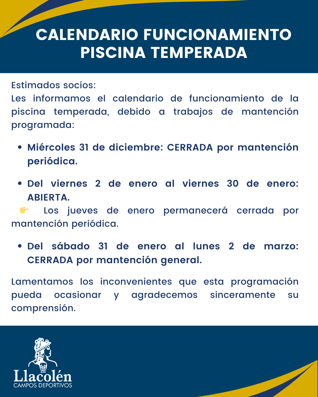 Les informamos el calendario de funcionamiento de la piscina temperada, debido a trabajos de mantención programada: